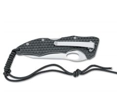 Derin parmak kanallarıyla birlikte, siyah G10 kabzadaki işleme olağanüstü bir kullanım sağlar. Klips (uç aşağı) ve kordon, bu günlük taşıma ve taktik çakı için kullanım kolaylığı sağlar.